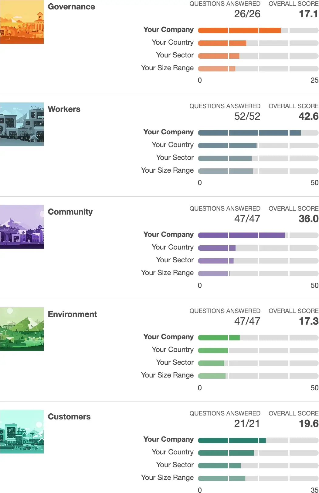 To become a B Corp, B Lab assesses a business against five impact areas: Governance, Workers, Community, Environment and Customers. They add up the scores for each pillar and that’s the overall score. For more information about each impact area and how companies are assessed against them, visit the B Corp website.