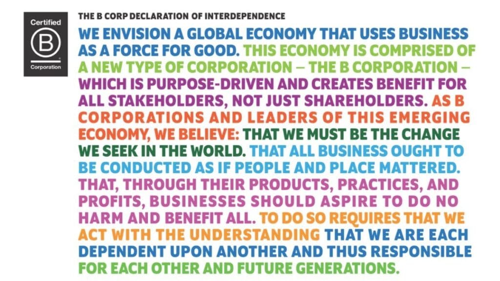 A high B Corp score is a badge of honour of sorts, but is also so much more. It’s a commitment to an ongoing process of transparency and improvement, as well as adopting the B Corp ‘Declaration of Interdependence’. We have definitely found that feedback from our initial certification has been formative in shaping our areas for organisation development.