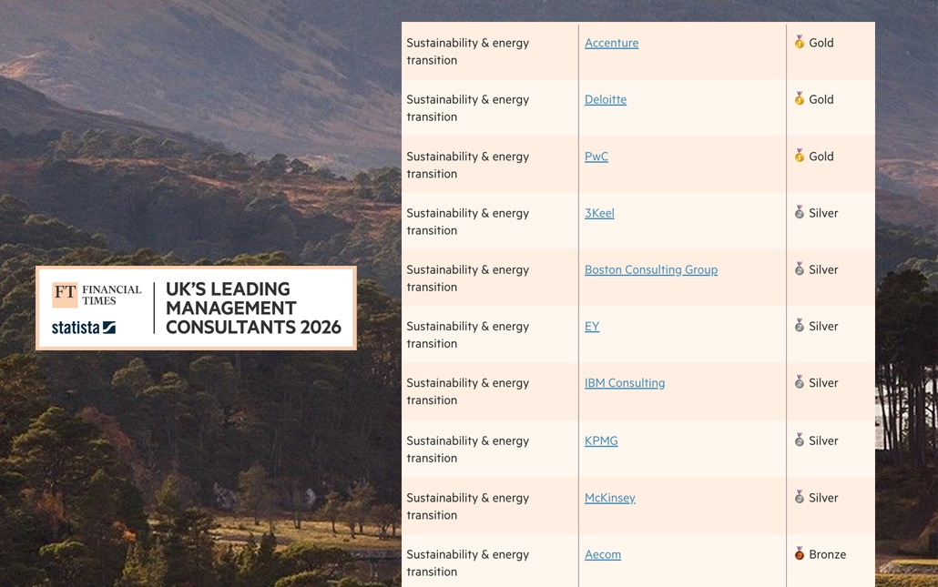 For 2026, the ‘Sustainability’ category where we have previously ranked Gold has evolved to a new category, for Sustainability and Energy Transition Consultancy Services. This year, we achieved Silver, just behind three global management consultancies that occupy the Gold position.