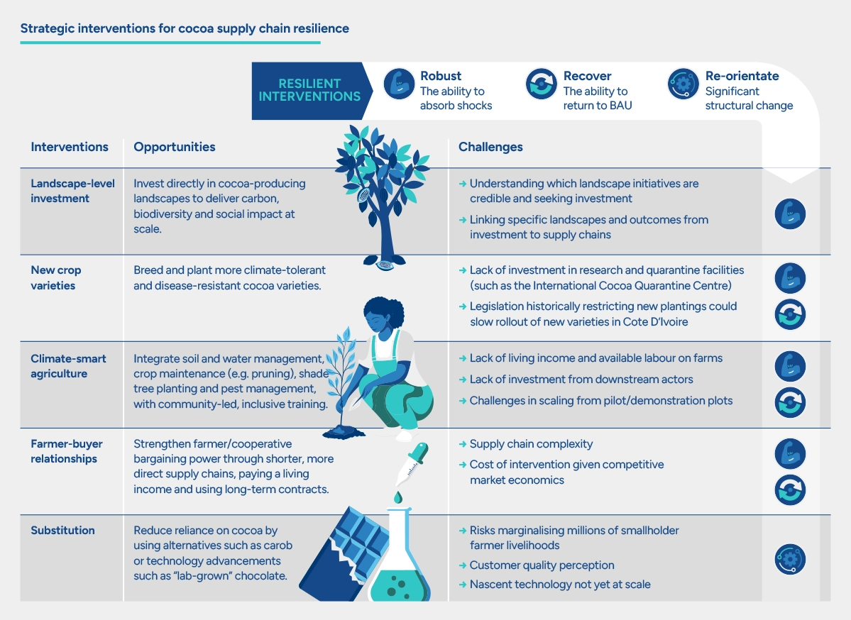The shocks felt in cocoa have demonstrated how fragile our global food supply chains are to climate change and interlinked social issues. While each supply chain is unique, there are lessons to draw for agricultural supply chains across all regions and sectors. Businesses cannot afford to ignore the early warning signal of cocoa. They must embed resilience into their decision-making and make changes now, to challenge short-termism and start to build a system for long-term food security.