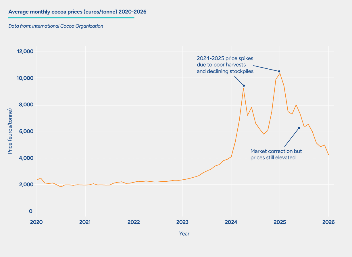 Later in 2025, we saw a market correction with demand softening as chocolate manufacturers adjusted to higher costs, while some regions’ production recovered. However, the vulnerability of cocoa supply chains due to the structural challenges of climate sensitivity and social pressures on farming communities remains unresolved. While in 2026 the market is more balanced, global prices are still elevated above previous normal levels. The clear exposure of the cocoa supply chain to shocks demonstrates the need for collective effort to build more resilient, climate-smart cocoa supply chains that can weather environmental shocks while supporting the livelihoods of smallholder farmers.